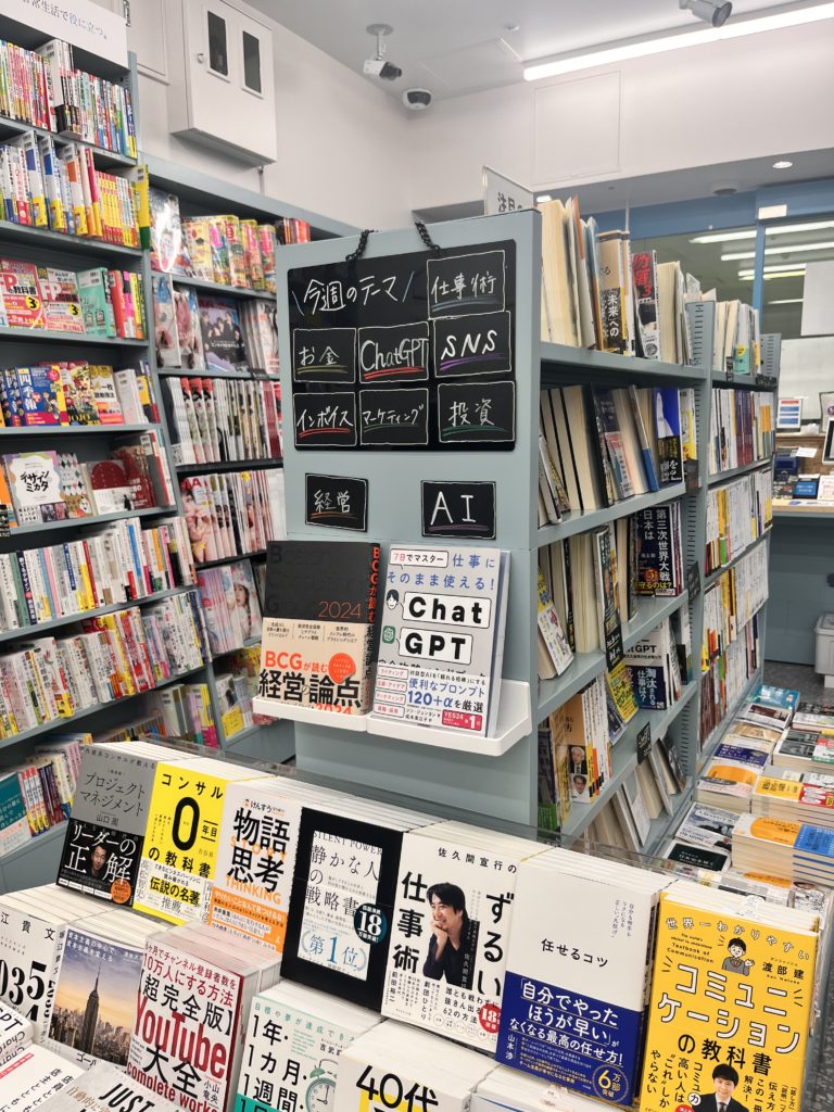 「今週のテーマ」と書かれた棚横ポップ。「投資」や「ChatGPT」、「インボイス」など、ニュースでも話題になっているテーマの書籍が集められている。
